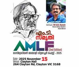 മെല്ബണ്: മെല്ബണിലെ വിപഞ്ചിക ഗ്രന്ഥശാല ഒരുക്കുന്ന ഓസ്ട്രേലിയന് മലയാളി ലിറ്ററേച്ചര് ഫെസ്റ്റിവലില് പ്രധാന ആകര്ഷണമായി എംടി സ്മൃതി അരങ്ങേറും. മലയാളത്തിന്റെ അനശ്വര കഥാകാരന് എം ടി വാസുദേവന് നായരുടെ കഥകളില് നിന്നു തിരഞ്ഞെടുത്ത ഭാഗങ്ങളുടെ വായനയും എംടിയുടെ ചിത്രങ്ങളിലെ ഗാനങ്ങളും ഉള്ക്കൊള്ളിച്ചുകൊണ്ടുള്ള ഈ പ്രത്യേക പരിപാടി അതിന്റെ തനിമകൊണ്ടും എംടിയോടുള്ള ഓസ്ട്രേലിയയിലെ മലയാളി സമൂഹത്തിന്റെ ആദരവുകൊണ്ടും പ്രത്യേകം ശ്രദ്ധിക്കപ്പെടുമെന്ന് സംഘാടകര് അറിയിച്ചു.