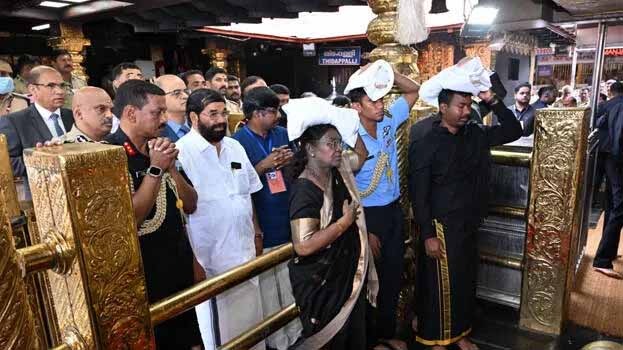 പത്തനംതിട്ട: കറുപ്പുടുത്ത്, ഇരുമുടിക്കെട്ടേന്തി രാഷ്ട്രപതി ദ്രൗപദി മുര്മു പതിനെട്ടാം പടി ചവിട്ടി ശരണം വിളിച്ച് കാനനവാസന്റെ സവിധത്തിലെത്തി മനംനിറയെ തൊഴുതു. രാവിലെ പതിനൊന്നരയോടെയായിരുന്നു രാഷ്ട്രപതി സന്നിധാനത്തിലെത്തുന്നത്. പതിനെട്ടാം പടി കയറിയെത്തുന്ന കൊടിമരച്ചുവട്ടില് തന്ത്രി കണ്ഠരര് മഹേഷ് മോഹനന് പൂര്ണകുംഭം നല്കി രാഷ്ട്രപതിയെ സന്നിധാനത്ത് വരവേറ്റു.